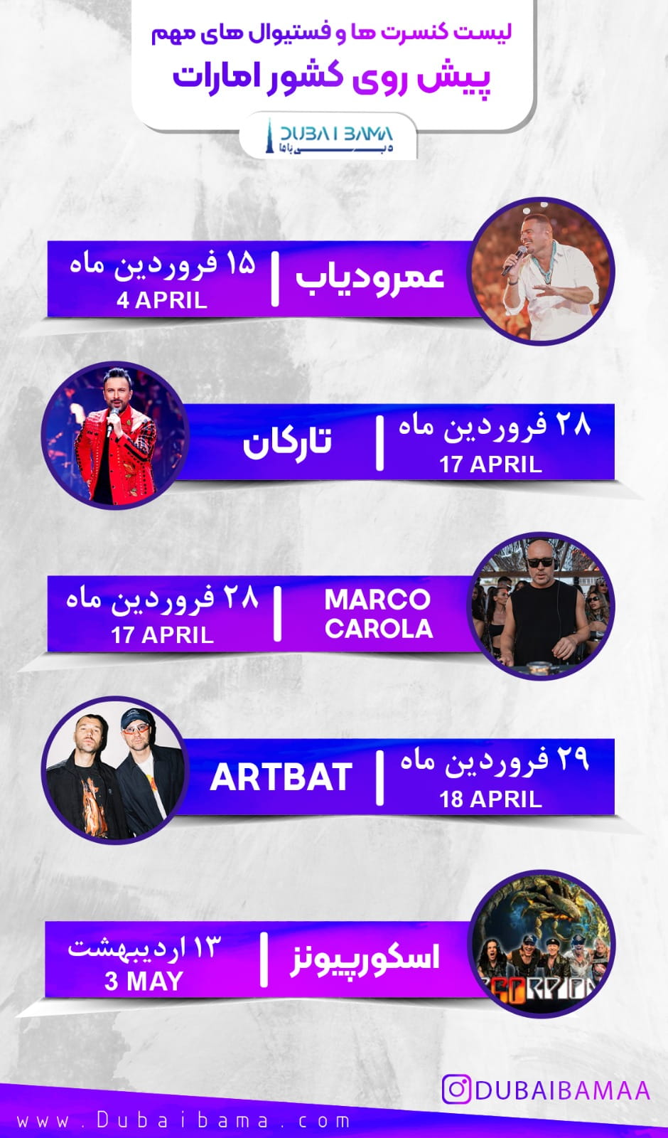 رویدادها کنسرت عمرو دیاب (Amr Diab) در دبی 15 فروردین 1405 اطلاعات بیشتر... بهمن 14, 1404 بدون دیدگاه